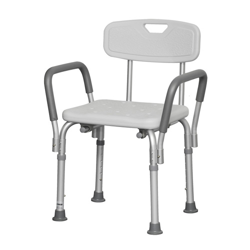With Back * Non-retail carton * Removable padded armrests provide comfort and added security * Blow molded bench and back provide comfort and strength * Drainage holes in bench reduce slipping * Aluminum frame is lightweight durable and corrosion proof * Tool free assembly * Legs are height adjustable to accommodate large and small individuals * Limited Lifetime Warranty * Width (outside legs)16 * Seat width 16 * Depth (outside legs) 17.3 * Adjustable seat depths 14 15 16.5 * Seat height highest 20 ; lowest 16 * Knocked-down * 300 lbs. weight capacity