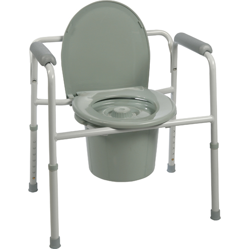 ProBasics Three-in-One Steel Commode with Plastic Armrests. The ProBasics Three-in-One Welded Steel Commode has three versatile functions; it can be used as a toilet safety frame a commode and a raised toilet seat. 300 lb weight capacity. The ProBasics Three-in-One Steel Commode has three versatile functions; it can be used as a toilet safety frame a commode and a raised toilet seat. It features a removable back and comes complete with commode bucket splash guard and lid. The versatile design includes a full size seat armrests for added comfort angled legs for stability and nonmarring rubber tips. Can function as a free-standing commode a toilet safety frame (with backrest removed) or as a raised toilet seat with arms Features a full size seat Durable steel-welded frame is attractive strong and easy-to-clean Tool-free assembly includes plastic snap on seat with lid Seat height readily adjusts in one-inch increments Plastic arms provide added comfort Comes complete with commode bucket with handle cover and splash guard Sold 4/cs HCPCS Code: E0163* Seat Opening: 8 W x 10 D Seat Dimensions:13.5 W x 16.5 D Warranty Limited lifetime on frame: One year on all parts Outside Width:24 Width Between Arms:17.5 Product Material: Steel Weight Capacity: 300 lbs. Color:Grey