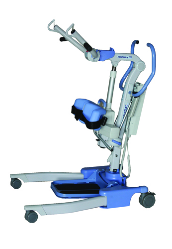 The Journey�s unique folding design stands unaided for easy storage * Compact design also provides an ideal size for transporting * It is the only standaid on the market that folds * The unique adjustable cowhorn mechanism supports a range of resident heights and sizes * Ideal for transfers from low chairs * Sculpted knee pad is easily adjusted for ultimate patient comfort * Adjustable with one hand * Bump guard provides additional protection against base plates and paint finishes in your facility * Specifications: Safe Working Load………………………………. 341 lbs………155 kgs Maximum Overall Length………………………… 39.4 …… 1000 mm Minimum Overall Length…………………………. 36.8 …….. 935 mm Maximum Overall Height…………………………. 63.0 …… 1600 mm Minimum Overall Height………………………….. 44.5 …….1130 mm Maximum Height to Attachment Point……….. 60.2 …… 1530 mm Minimum Height to Attachment Point………… 28.4 …….. 720 mm Turning Radius………………………………………. 45.1 …….1145 mm Legs Open – External Width ……………………. 38.2 …….. 970 mm Legs Open – Internal Width……………………… 34.5 …….. 875 mm Legs Closed – External Width ………………….. 27.0 …….. 685 mm Legs Closed – Internal Width …………………… 22.2 …….. 590 mm Widest Point (between support handles)……. 18.8 …….. 475 mm Overall Height of Legs………………………………. 4.3 ………110 mm Ground Clearance……………………………………. 1.2 ………. 30 mm Front Twin Casters…………………………………… 3.0 ………. 75 mm Rear Braked Casters………………………………… 4.0 …….. 100 mm