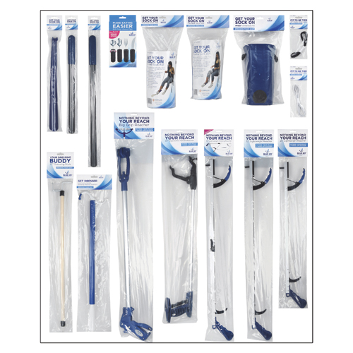4 foot section with 16 facings and 76 total skus * Includes 4 of each of the following items: BJ100210 Make Eating Easier Big Grip Utensil Set BJ100100 Get Your Sock On Formed Sock Aid BJ100101 Get Your Sock On Flexible Sock Aid BJ100103 Get Your Sock On Formed Sock Aid Wide Includes 5 of each of the following items: BJ100147 Get Your Shoe On 18 Plastic Shoehorn BJ100144 Get Your Shoe On 18 Metal Shoehorn BJ100145 Get Your Shoe On 24 Metal Shoehorn BJ100130 Fit To Be Tied 24 Elastic Shoe Laces Black BJ100131 Fit To Be Tied 24 Elastic Shoe Laces White BJ100110 Your Dressing Buddy 27 Dressing Stick BJ100140 2-in-1 Long Handle Dressing Aid with Shoehorn BJ100159 Nothing Beyond Your Reach 30 Big Grip Large Mouth Reacher BJ100158 Nothing Beyond Your Reach 30 Ergonomic Handle Reacher BJ100153 Nothing Beyond Your Reach 32 Lightweight Folding Reacher BJ100151 Nothing Beyond Your Reach 32 Lightweight Reacher BJ100150 Nothing Beyond Your Reach 26 Lightweight Reacher